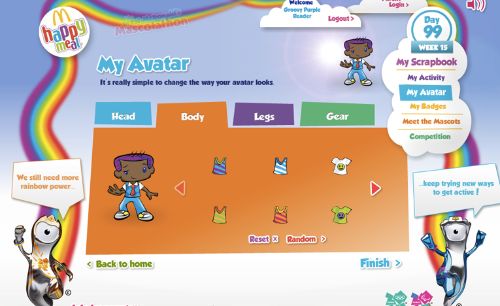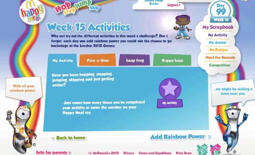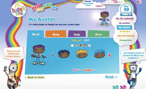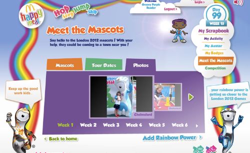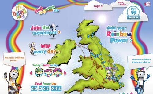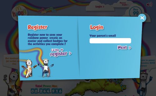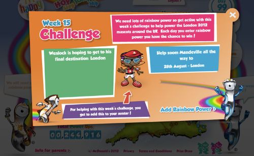 In the run up to the 2012 Olympics, mascots Wenlock and Mandeville did a personal appearance tour of the country. Kids were encouraged to power them to their next destination on a specially created interactive website. We gave away 10 million step-o-meters, jump-o-meters, running batons and bat and ball sets. Each one had an embedded counting device, so kids could measure their activity and record it online to create "Rainbow Power" for Wenlock and Mandeville.