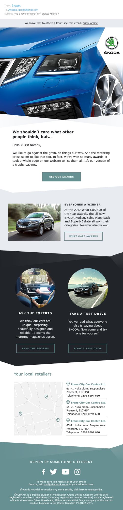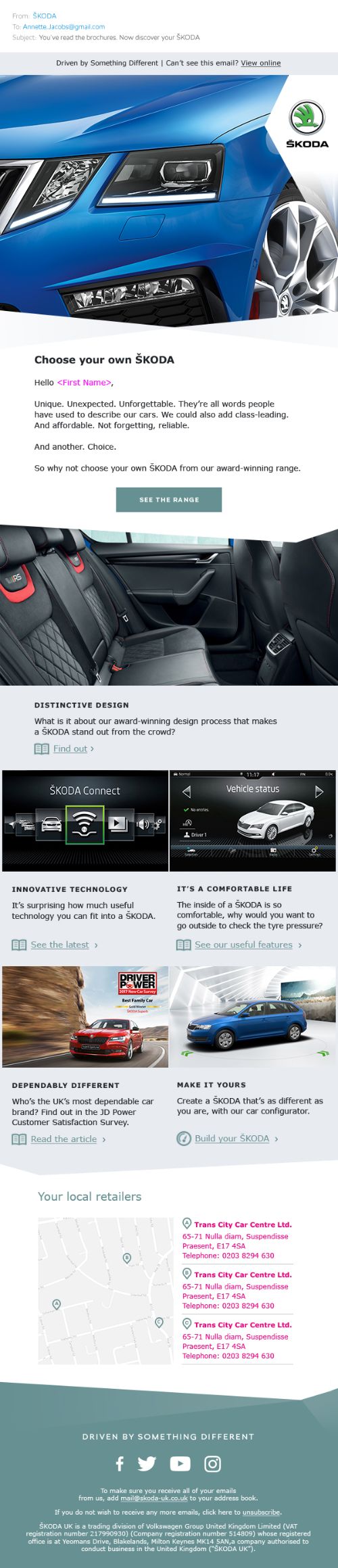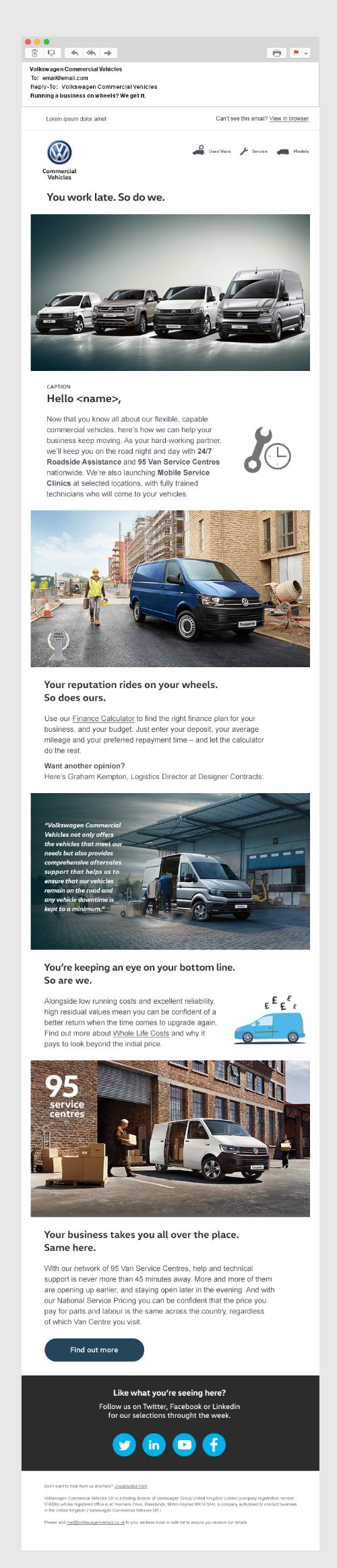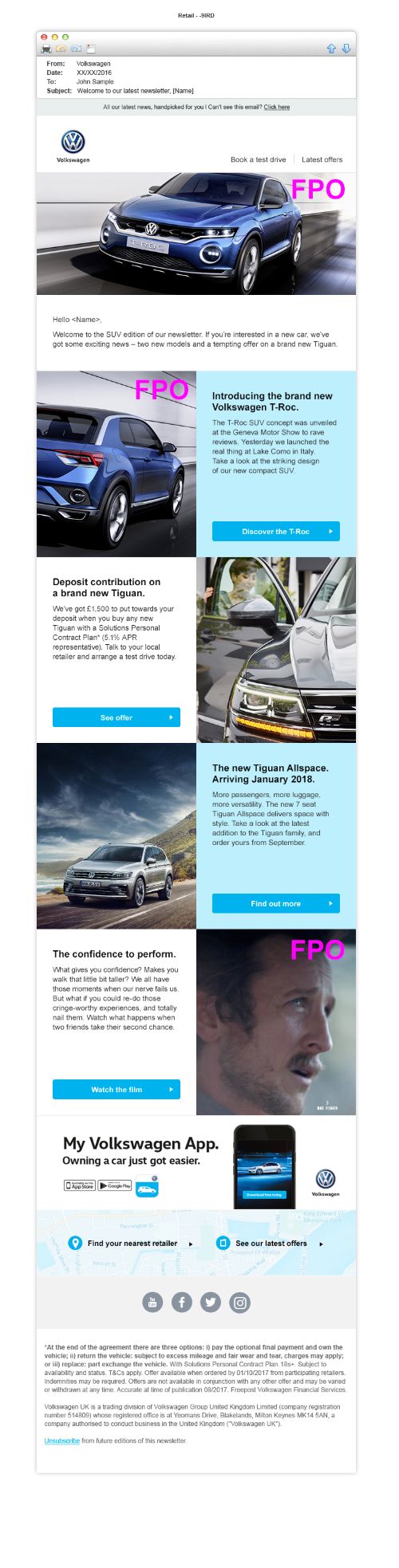 As Head of Copy on the Volkswagen, ŠKODA, SEAT and Audi accounts, I was responsible for ensuring that all the emails, newsletters and mail packs had a consistent tone of voice. I also created and wrote quite a lot of them.